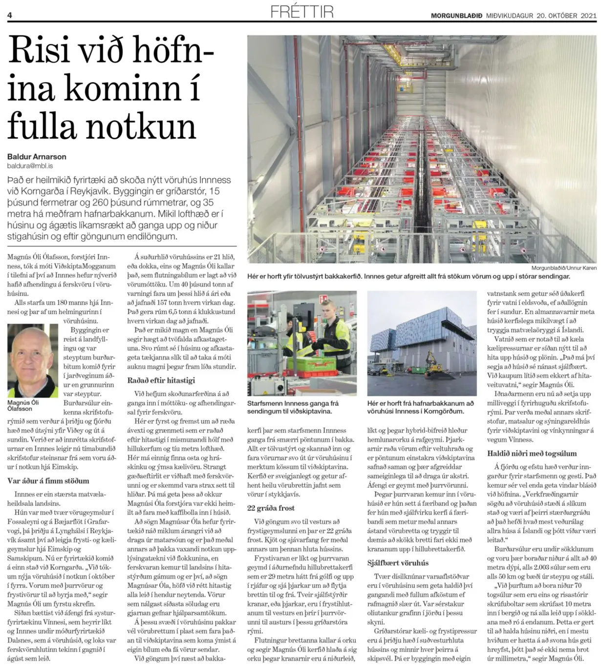 Viðtal í Morgunblaðinu við Magnús Óla, forstjóra Innnes, um nýja vöruhúsið að Korngörðum 3.