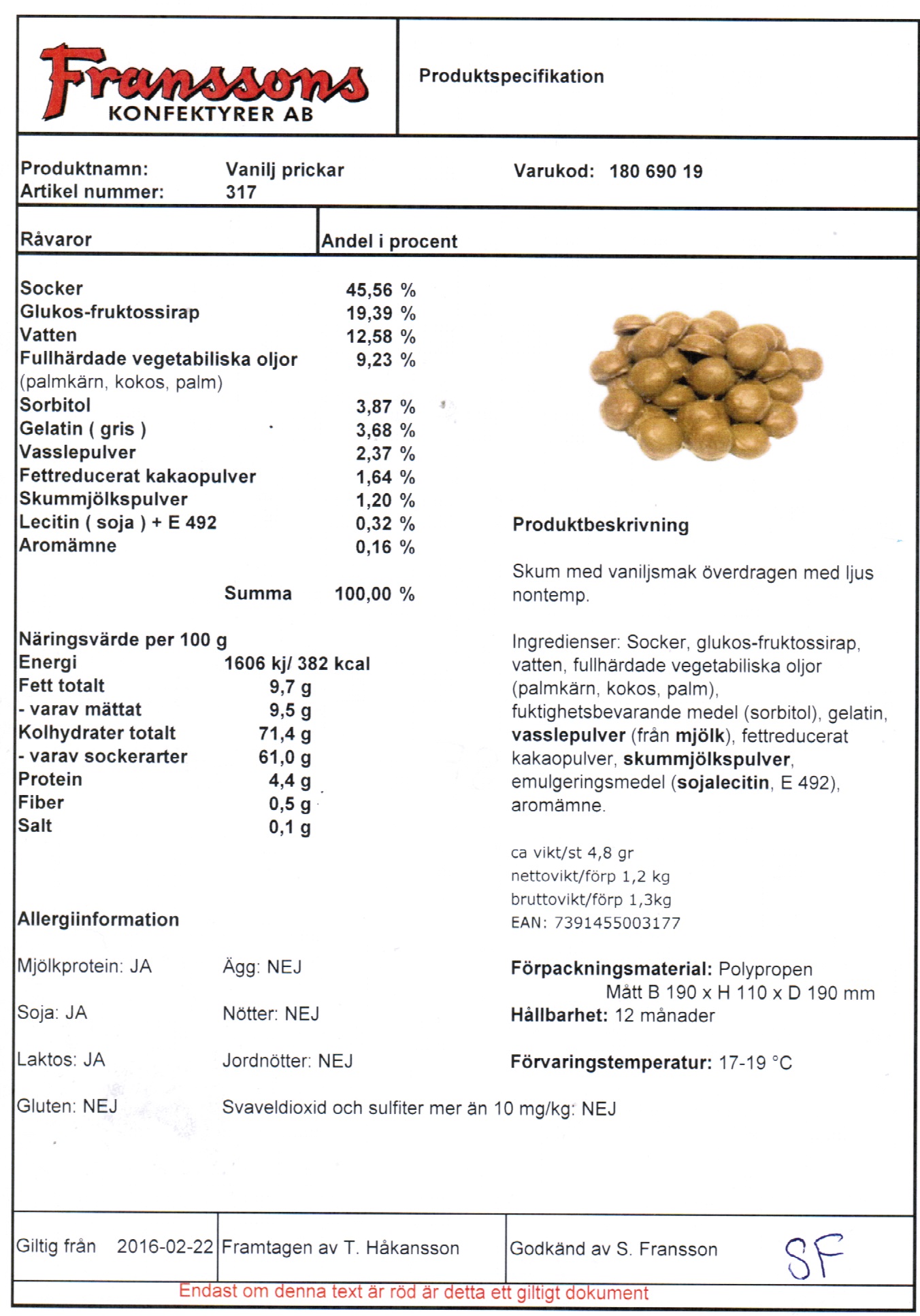 Innihald: Sykur, glúkósa-frúktósasíróp, vatn, fullhertar jurtaolíur (pálmakjarna, kókos, pálma), rakaefni (E420), gelatín, mysuduft (mjólk), fituskert kakóduft, undanrennuduft, ýruefni (sojalesitín, E492), bragðefni. (Með sykri og sætuefnum) Innflytjandi: Innnes ehf. Upprunaland: Svíþjóð.